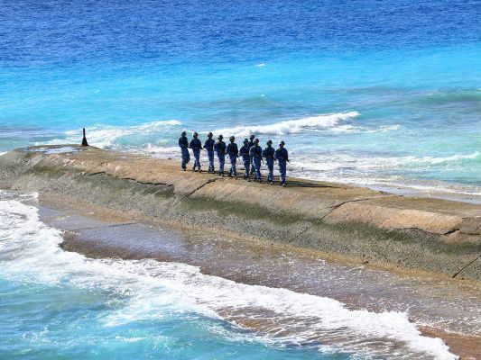 資料圖:守衛在南沙群島永暑礁上的海軍官兵在防波堤上巡邏。