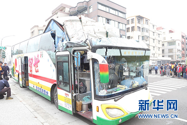這是2月4日拍攝的發(fā)生事故的游覽車。當日,一輛滿載大陸游客的游覽車在臺灣高雄市失控撞到路邊橋墩,造成車上多人受傷送醫(yī)。 新華社發(fā)