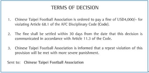 此前臺灣曾經因此而受罰。2016年10月8日,在中華臺北男足對陣東帝汶隊的亞洲杯比賽中,印度籍競賽官員就舉報臺灣球迷的旗幟“FORMOSA”具有政治意涵。臺灣自然極力辯解,但亞足聯在收到回文后,仍在11月8日召開紀律委員會做出裁決,判罰4000美元。【環球時報-環球網報道 記者 吳薇】