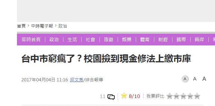 環(huán)球網(wǎng)綜合報(bào)道 臺(tái)中市國(guó)民黨團(tuán)日前召開(kāi)記者會(huì),批評(píng)市長(zhǎng)林佳龍“偉人佳龍”舉債爆增。臺(tái)灣“聯(lián)合新聞網(wǎng)”3日又報(bào)道稱(chēng),臺(tái)中市各級(jí)學(xué)校這學(xué)期收到一份公文,內(nèi)容是修訂各校“歸屬臺(tái)中市所有拾得物要點(diǎn)”,最受關(guān)注的是規(guī)定以后在校內(nèi)撿到現(xiàn)金,全要列冊(cè)繳市庫(kù)。