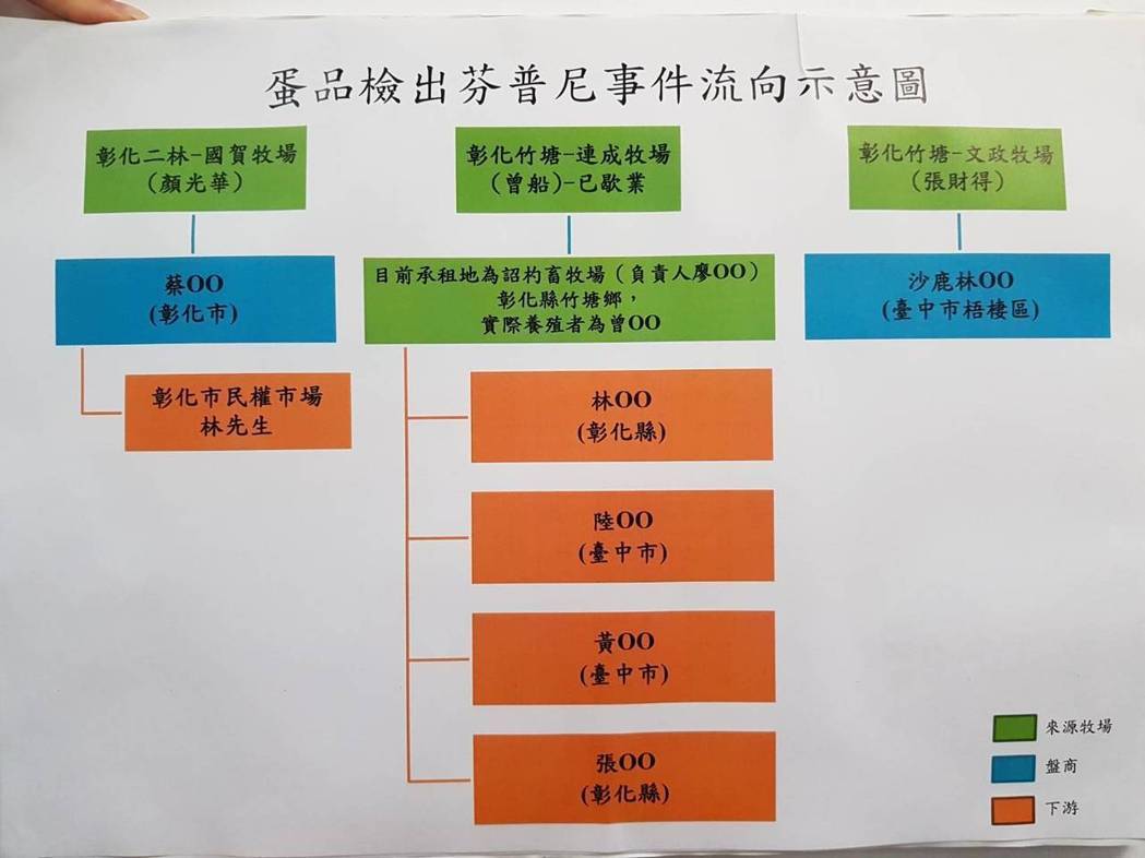 “農委會”副主委陳吉仲表示,歐洲與韓國都發生了“芬普尼雞蛋污染”事件,臺“行政院”與“食安辦”要求各單位進行畜牧場以及上市雞蛋的抽驗。同時,“農委會防檢局”也同步作芬普尼檢驗,前天在45件樣本中已確認有3家牧場驗出芬普尼,且這3家蛋雞場都集中在彰化,相關部門第一時間已進行移動管制。