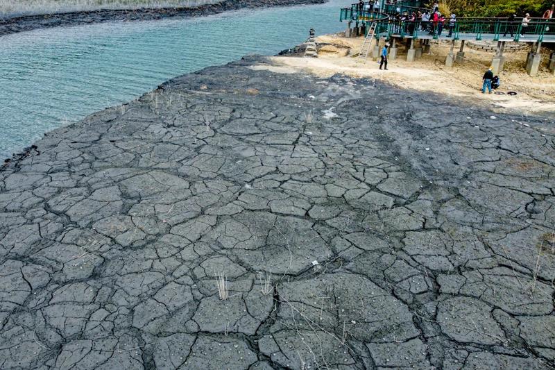 中部地區的蓄水情況也逐漸緊張,日月潭著名景點“九蛙疊像”近期浮出水面,部分潭底已露出,也出現干涸、龜裂的現象。