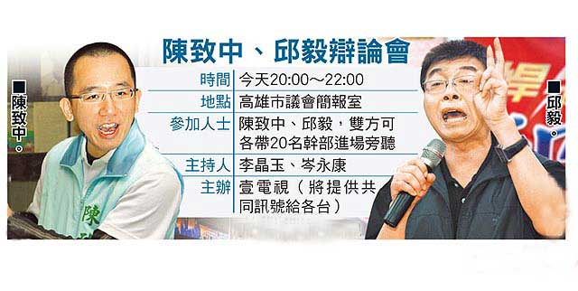 報道指出,壹電視邀請邱毅及陳致中電視辯論,原定上周四晚上在高雄市前鎮憲德宮廣場舉辦,因警方擔心沖突,未準許集會;壹電視再協調,當晚三方達成共識改到高雄市勞工公園大禮堂。但邱毅昨發聲明,高雄市議長許崑源已商借高雄市議會會議廳為辯論場所,且辯論會不應由一家媒體壟斷,應開放所有媒體均可采訪轉播。