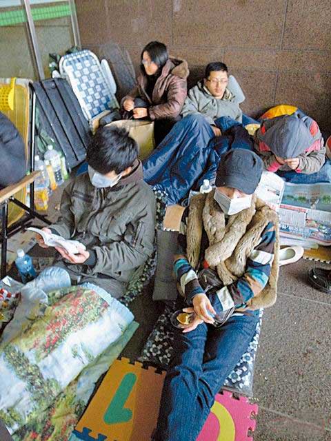 臺北市府一樓的申請路權(quán)排隊區(qū),國民黨與民進黨分別派人漏夜排隊,還準(zhǔn)備睡袋。圖片來自臺媒