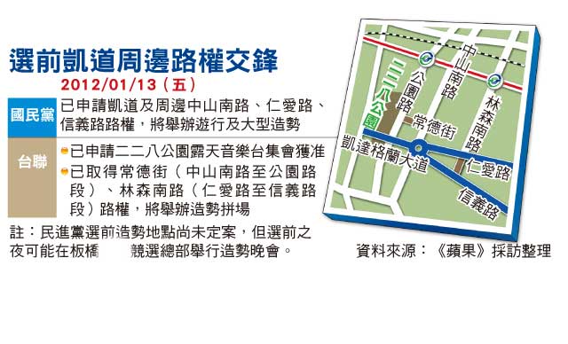 報道稱,在確定拿下凱達格蘭大道路權(quán)后,馬英九、吳敦義競選總部昨宣布選前最后黃金周將在臺灣北、中、南、東部舉行大型造勢晚會與嘉年華式的大游行。