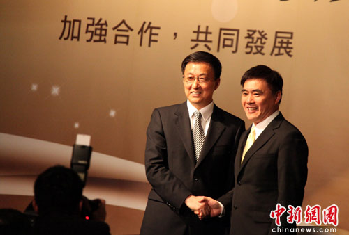 4月6日下午,“上海-臺北城市論壇”在臺北市晶華酒店登場,上海市長韓正、臺北市長郝龍斌分別發表演講。圖為兩人在演講結束后握手致意。中新社發 董會峰 攝