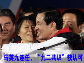 臺灣地區領導人選舉投票1月14日下午4時結束。開票結果顯示,中國國民黨候選人馬英九、吳敦義獲勝,得票6891139張,得票率為51.6%。【詳細】