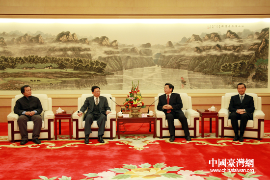 17日晚,廣西壯族自治區黨委書記郭聲琨(右二)和中臺辦、國臺辦主任王毅(右一)一起,會見來桂林參加第九屆兩岸關系研討會的臺灣中華文化總會會長劉兆玄(左二)等嘉賓。(中國臺灣網 鐘寶華 攝)
