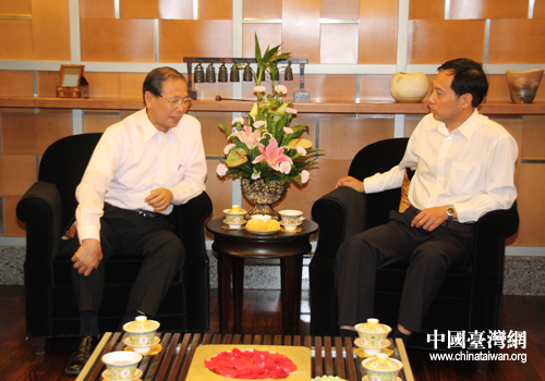 農(nóng)業(yè)部總經(jīng)濟師陳萌山(右)會見代表團臺中縣縣長黃仲生等一行。(中國臺灣網(wǎng) 焦瑩瑩 攝)