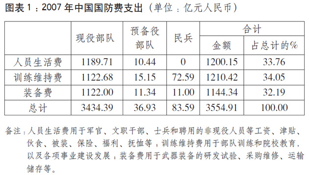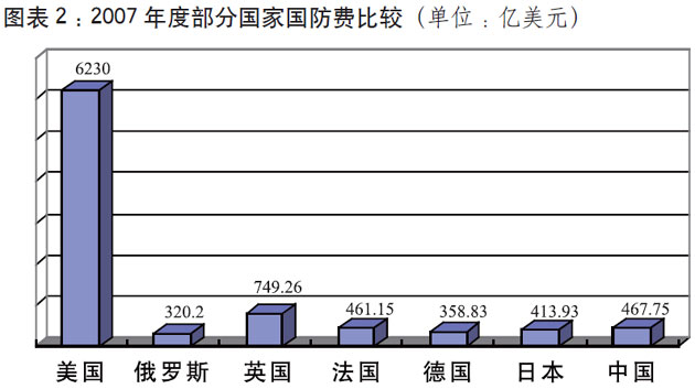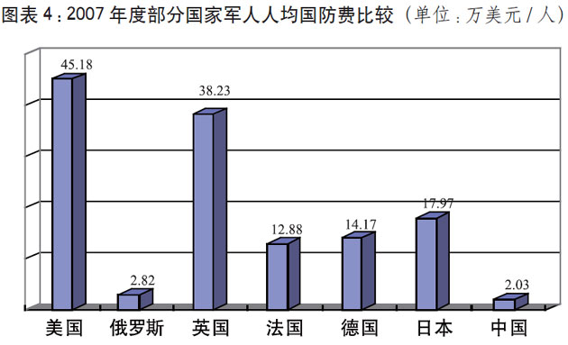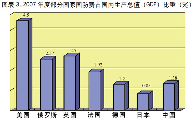 中國國防費總額、軍人人均數額,仍低于世界一些主要大國的水平。2007年,中國年度國防費相當于美國的7.51%、英國的62.43%。軍人人均數額是美國的4.49%,日本的11.3%,英國的5.31%,法國的15.76%,德國的14.33%。從國家國防負擔的相對比例看,中國國防費僅占國內生產總值的1.38%,而美國占4.5%,英國占2.7%,法國占1.92%。