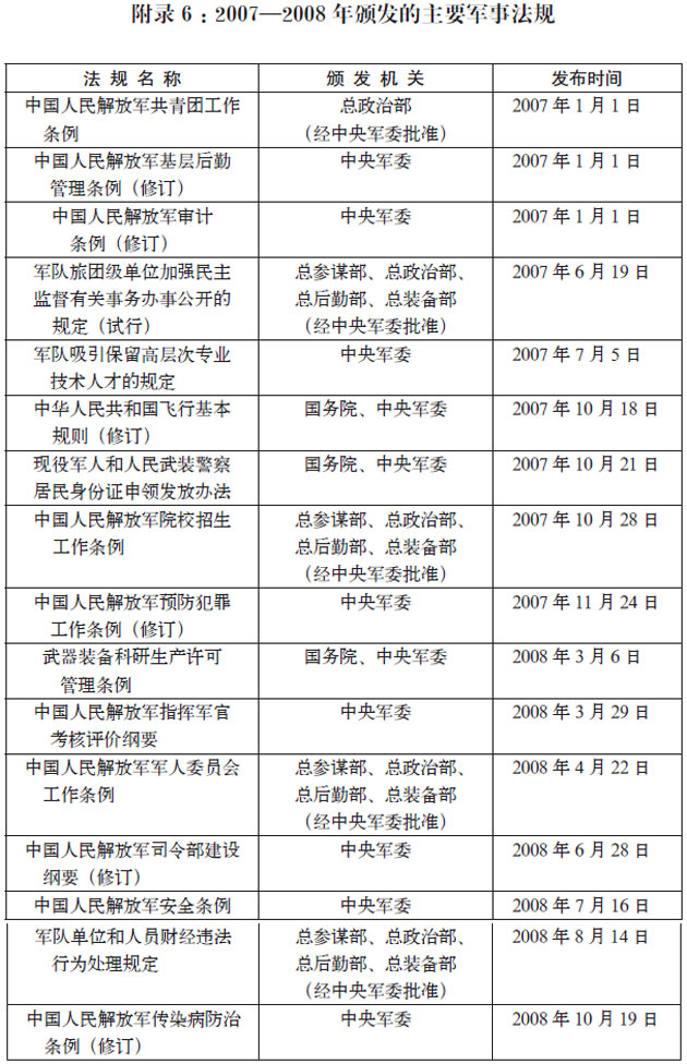 附錄6:2007—2008年頒發的主要軍事法規