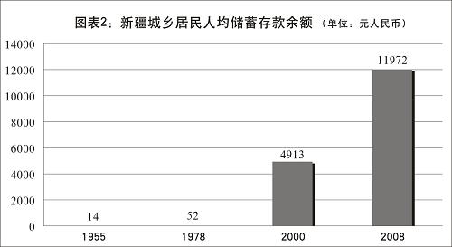 在經(jīng)歷了消除貧困、解決溫飽發(fā)展階段后,目前新疆各族人民生活正在向小康邁進(jìn),生活質(zhì)量大幅提高。2008年,新疆農(nóng)民人均純收入達(dá)3503元人民幣,比改革開(kāi)放初期的1978年增長(zhǎng)28倍,比西部大開(kāi)發(fā)初期的2000年增長(zhǎng)1.2倍;城鎮(zhèn)居民人均可支配收入11432元人民幣,比1978年增長(zhǎng)35倍,比2001年增長(zhǎng)1倍。城鄉(xiāng)居民人均儲(chǔ)蓄存款余額1955年為14元人民幣、1978年為52元人民幣、2000年為4913元人民幣,2008年為11972元人民幣。居民人均消費(fèi)水平1952年為122元人民幣、1978年為181元人民幣、2000年為2662元人民幣,2007年為4890元人民幣。