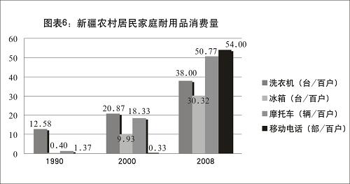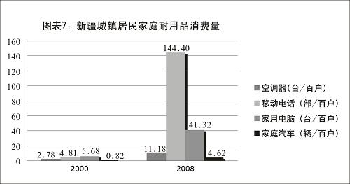 城鄉(xiāng)居民家庭耐用消費(fèi)品數(shù)量不斷增長(zhǎng)。農(nóng)村居民家庭每百戶擁有洗衣機(jī)數(shù)量從1990年的12.58臺(tái)、2000年的20.87臺(tái),增長(zhǎng)到2008年的38.00臺(tái);冰箱數(shù)量從1990年的0.40臺(tái)、2000年的9.93臺(tái),增長(zhǎng)到2008年的30.32臺(tái);摩托車數(shù)量從1990年的1.37輛、2000年的18.33輛,增長(zhǎng)到2008年的50.77輛;移動(dòng)電話數(shù)量從2000年的0.33部,增長(zhǎng)到2008年的54.00部。城鎮(zhèn)居民家庭每百戶擁有空調(diào)器從2000年的2.78臺(tái)增長(zhǎng)到2008年的11.18臺(tái);移動(dòng)電話從2000年的4.81部增長(zhǎng)到2008年的144.40部;家用電腦從2000年的5.68臺(tái)增長(zhǎng)到2008年的41.32臺(tái);家庭汽車從2000年的0.82輛增長(zhǎng)到2008年的4.62輛。