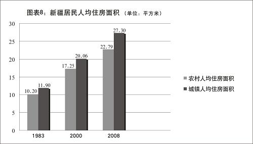 人民群眾生活條件不斷改善。交通工具多樣化使人們出行更加方便快捷,改革開(kāi)放初期從烏魯木齊到北京乘火車需耗時(shí)近一周,現(xiàn)今乘飛機(jī)僅需3個(gè)多小時(shí)。城市每萬(wàn)人擁有鋪裝道路由1978年的1.6公里、2000年的4.5公里,增長(zhǎng)到2008年的15.7公里;城市每萬(wàn)人擁有公共汽車數(shù)量從1978年的3.1標(biāo)臺(tái),增加到2008年的13.2標(biāo)臺(tái)。住房條件得到極大改善。農(nóng)村人均住房面積從1983年的10.20平方米、2000年的17.25平方米,增長(zhǎng)到2008年的22.79平方米;城鎮(zhèn)人均住房面積從1983年的11.90平方米、2000年的20.06平方米,增長(zhǎng)到2008年的27.30平方米。目前,全疆設(shè)市城市自來(lái)水普及率為97.86%,縣城為87.18%;城鎮(zhèn)集中供熱普及率為51.2%,污水處理率為68%,生活垃圾無(wú)害化處理率為16%;城市燃?xì)馄占奥蕿?9.33%,縣城為66.67%;城市綠化覆蓋率為30.49%,綠地率為26.19%,人均公共綠地面積為6.94平方米。近年來(lái),南疆庫(kù)爾勒、和田、喀什、阿圖什、阿克蘇、墨玉、洛浦、疏勒等23個(gè)縣市的30多萬(wàn)戶各族群眾用上了清潔且價(jià)格優(yōu)惠的天然氣。目前,南疆地區(qū)天然氣新用戶以每月上千戶的規(guī)模增長(zhǎng),“砍胡楊、燒胡楊”正在成為歷史。