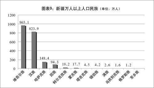 新疆民族眾多。據(jù)2000年全國(guó)第五次人口普查,新疆共生活著維吾爾、漢、哈薩克等55個(gè)民族。2008年,新疆總?cè)丝跒?130.8萬(wàn)人,其中漢族以外的其他民族1294.5萬(wàn)人,占全疆人口的60.8%。截至2007年,百萬(wàn)以上人口的民族有3個(gè):維吾爾族(965.1萬(wàn))、漢族(823.9萬(wàn))、哈薩克族(148.4萬(wàn));10-100萬(wàn)人口的民族有3個(gè):回族(94.3萬(wàn))、柯?tīng)柨俗巫澹?8.2萬(wàn))、蒙古族(17.7萬(wàn));1-10萬(wàn)人口的民族有6個(gè):塔吉克族(4.5萬(wàn))、錫伯族(4.2萬(wàn))、滿族(2.6萬(wàn))、烏孜別克族(1.6萬(wàn))、俄羅斯族(1.2萬(wàn))以及東鄉(xiāng)族。其余民族人口不到萬(wàn)人。