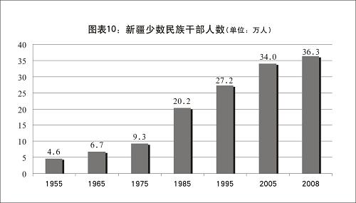 國(guó)家和自治區(qū)一直把選拔、培養(yǎng)和使用少數(shù)民族干部作為實(shí)行民族區(qū)域自治政策的關(guān)鍵,通過(guò)送去學(xué)習(xí)、加強(qiáng)培訓(xùn)、基層鍛煉、異地交流、掛職輪換等多種形式,培養(yǎng)和造就了一大批優(yōu)秀少數(shù)民族干部,少數(shù)民族干部隊(duì)伍的人數(shù)和素質(zhì)大幅提高,并保證各級(jí)各類少數(shù)民族干部的相應(yīng)比例。1955年,全疆有少數(shù)民族干部4.6萬(wàn)人,1965年為6.7萬(wàn)人,1975年為9.3萬(wàn)人,1985年為20.2萬(wàn)人,1995年為27.2萬(wàn)人,2005年為34.0萬(wàn)人,2008年為36.3萬(wàn)人,占全疆干部總數(shù)的51.25%。目前,自治區(qū)的政府主席、各自治州的州長(zhǎng)、自治縣的縣長(zhǎng)以及相應(yīng)的人大常委會(huì)主任、人民法院院長(zhǎng)、人民檢察院檢察長(zhǎng)都由實(shí)行民族區(qū)域自治的民族的公民擔(dān)任,絕大多數(shù)的地、州、市的專員、州長(zhǎng)和市長(zhǎng)以及縣長(zhǎng)、區(qū)長(zhǎng)由少數(shù)民族干部擔(dān)任。