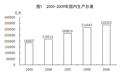 中華人民共和國(guó) 中華人民共和國(guó)國(guó)家統(tǒng)計(jì)局 2010年2月25日 2009年,全國(guó)各族人民在黨中央、國(guó)務(wù)院的領(lǐng)導(dǎo)下,以鄧小平理論和“三個(gè)代表”重要思想為指導(dǎo),深入貫徹落實(shí)科學(xué)發(fā)展觀,認(rèn)真貫徹積極的財(cái)政政策和適度寬松的貨幣政策,全面落實(shí)應(yīng)對(duì)國(guó)際金融危機(jī)的一攬子計(jì)劃和政策措施,國(guó)民經(jīng)濟(jì)形勢(shì)總體回升向好,各項(xiàng)社會(huì)事業(yè)取得新的進(jìn)展。 一、綜合 初步核算,全年國(guó)內(nèi)生產(chǎn)總值335353億元,比上年增長(zhǎng)8.7%。分產(chǎn)業(yè)看,第一產(chǎn)業(yè)增加值35477億元,增長(zhǎng)4.2%;第二產(chǎn)業(yè)增加值156958億元,增長(zhǎng)9.5%;第三產(chǎn)業(yè)增加值142918億元,增長(zhǎng)8.9%。第一產(chǎn)業(yè)增加值占國(guó)內(nèi)生產(chǎn)總值的比重為10.6%,比上年下降0.1個(gè)百分點(diǎn);第二產(chǎn)業(yè)增加值比重為46.8%,下降0.7個(gè)百分點(diǎn);第三產(chǎn)業(yè)增加值比重為42.6%,上升0.8個(gè)百分點(diǎn)。