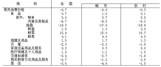 全年居民消費(fèi)價(jià)格比上年下降0.7%,其中食品價(jià)格上漲0.7%。固定資產(chǎn)投資價(jià)格下降2.4%。工業(yè)品出廠價(jià)格下降5.4%,其中生產(chǎn)資料價(jià)格下降6.7%,生活資料價(jià)格下降1.2%。原材料、燃料、動(dòng)力購(gòu)進(jìn)價(jià)格下降7.9%。農(nóng)產(chǎn)品生產(chǎn)價(jià)格下降2.4%。農(nóng)業(yè)生產(chǎn)資料價(jià)格下降2.5%。70個(gè)大中城市房屋銷售價(jià)格上漲1.5%,其中新建住宅價(jià)格上漲1.3%,二手住宅價(jià)格上漲2.4%;房屋租賃價(jià)格下降0.6%。