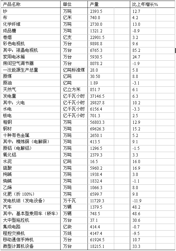 全年規(guī)模以上工業(yè)中,煤炭開(kāi)采和洗選業(yè)增加值比上年增長(zhǎng)8.3%;石油和天然氣開(kāi)采業(yè)增長(zhǎng)4.8%;農(nóng)副食品加工業(yè)增長(zhǎng)15.9%;紡織業(yè)增長(zhǎng)8.5%;通用設(shè)備制造業(yè)增長(zhǎng)11.0%;專用設(shè)備制造業(yè)增長(zhǎng)13.0%;交通運(yùn)輸設(shè)備制造業(yè)增長(zhǎng)18.4%,其中汽車制造增長(zhǎng)20.3%,船舶制造增長(zhǎng)20.7%;通信設(shè)備、計(jì)算機(jī)及其他電子設(shè)備制造業(yè)增長(zhǎng)5.3%;電氣機(jī)械及器材制造業(yè)增長(zhǎng)12.0%。6大高載能行業(yè)比上年增長(zhǎng)10.6%,其中,非金屬礦物制品業(yè)增長(zhǎng)14.7%,化學(xué)原料及化學(xué)制品制造業(yè)增長(zhǎng)14.6%,有色金屬冶煉及壓延加工業(yè)增長(zhǎng)12.8%,黑色金屬冶煉及壓延加工業(yè)增長(zhǎng)9.9%,電力、熱力的生產(chǎn)和供應(yīng)業(yè)增長(zhǎng)6.0%,石油加工、煉焦及核燃料加工業(yè)增長(zhǎng)5.2%。高技術(shù)制造業(yè)增加值比上年增長(zhǎng)7.7%。 表2:2009年主要工業(yè)產(chǎn)品產(chǎn)量及其增長(zhǎng)速度