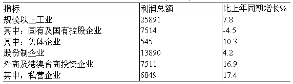 1-11月全國(guó)規(guī)模以上工業(yè)企業(yè)累計(jì)實(shí)現(xiàn)利潤(rùn)25891億元,比上年同期增長(zhǎng)7.8%。 表3:2009年1-11月規(guī)模以上工業(yè)企業(yè)實(shí)現(xiàn)利潤(rùn)及其增長(zhǎng)速度 單位:億元