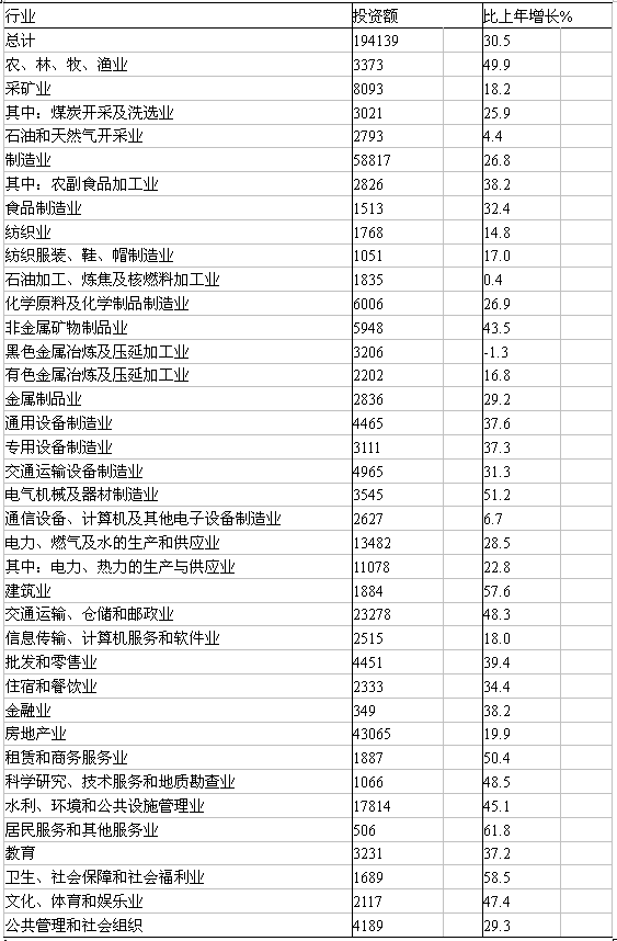 在城鎮(zhèn)投資中,第一產(chǎn)業(yè)投資3373億元,比上年增長(zhǎng)49.9%;第二產(chǎn)業(yè)投資82277億元,增長(zhǎng)26.8%;第三產(chǎn)業(yè)投資108489億元,增長(zhǎng)33.0%。 表4:2009年分行業(yè)城鎮(zhèn)固定資產(chǎn)投資及其增長(zhǎng)速度 單位:億元