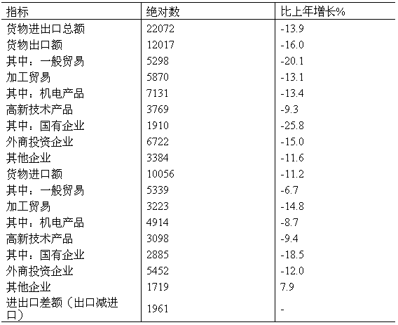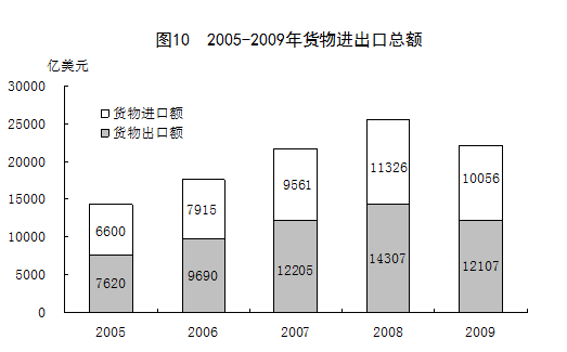 在限額以上批發(fā)和零售業(yè)零售額中,汽車類零售額比上年增長(zhǎng)32.3%,糧油類增長(zhǎng)13.0%,肉禽蛋類增長(zhǎng)8.3%,服裝類增長(zhǎng)20.8%,日用品類增長(zhǎng)15.6%,文化辦公用品類增長(zhǎng)6.7%,通訊器材類下降1.3%,化妝品類增長(zhǎng)16.9%,金銀珠寶類增長(zhǎng)15.9%,中西藥品類增長(zhǎng)21.7%,家用電器和音像器材類增長(zhǎng)12.3%,家具類增長(zhǎng)35.5%,建筑及裝潢材料類增長(zhǎng)26.6%。 六、對(duì)外經(jīng)濟(jì) 全年貨物進(jìn)出口總額22072億美元,比上年下降13.9%。其中,貨物出口12017億美元,下降16.0%;貨物進(jìn)口10056億美元,下降11.2%。進(jìn)出口差額(出口減進(jìn)口)1961億美元,比上年減少1020億美元。 表7:2009年貨物進(jìn)出口總額及其增長(zhǎng)速度 單位:億美元