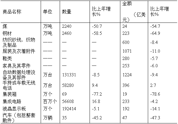 表8:2009年主要商品出口數(shù)量、金額及其增長(zhǎng)速度