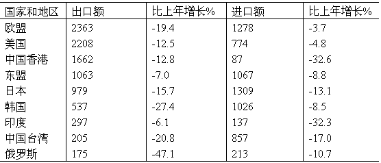 表10:2009年對(duì)主要國(guó)家和地區(qū)貨物進(jìn)出口額及其增長(zhǎng)速度 單位:億美元