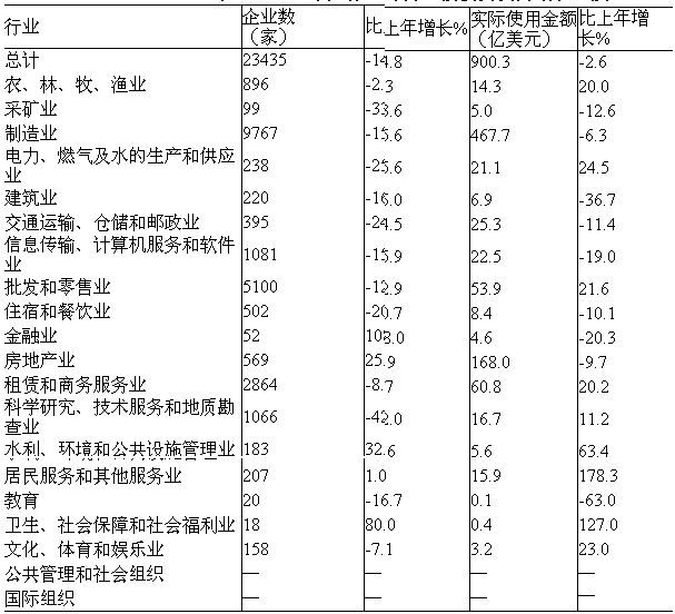 全年非金融領(lǐng)域新批外商直接投資企業(yè)23435家,比上年減少14.8%。實(shí)際使用外商直接投資金額900億美元,下降2.6%。其中,制造業(yè)占52.0%;房地產(chǎn)業(yè)占18.7%;租賃和商務(wù)服務(wù)業(yè)占6.8%;批發(fā)和零售業(yè)占6.0%;交通運(yùn)輸、倉(cāng)儲(chǔ)和郵政業(yè)占2.8%。 表11:2009年分行業(yè)外商直接投資及其增長(zhǎng)速度