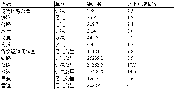 全年非金融類對(duì)外直接投資額433億美元,比上年增長(zhǎng)6.5%。 全年對(duì)外承包工程業(yè)務(wù)完成營(yíng)業(yè)額777億美元,比上年增長(zhǎng)37.3%;對(duì)外勞務(wù)合作完成營(yíng)業(yè)額89億美元,增長(zhǎng)10.6% 七、交通、郵電和旅游 全年交通運(yùn)輸、倉(cāng)儲(chǔ)和郵政業(yè)增加值17058億元,比上年增長(zhǎng)3.7%。 表12:2009年各種運(yùn)輸方式完成貨物運(yùn)輸量及其增長(zhǎng)速度