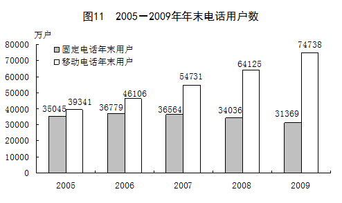 全年規(guī)模以上港口完成貨物吞吐量69.1億噸,比上年增長(zhǎng)8.2%,其中外貿(mào)貨物吞吐量21.4億噸,增長(zhǎng)8.6%。港口集裝箱吞吐量12082萬(wàn)標(biāo)準(zhǔn)箱,下降5.8%。 年末全國(guó)民用汽車保有量達(dá)到7619萬(wàn)輛(包括三輪汽車和低速貨車1331萬(wàn)輛),比上年末增長(zhǎng)17.8%,其中私人汽車保有量5218萬(wàn)輛,增長(zhǎng)25.0%。民用轎車保有量3136萬(wàn)輛,增長(zhǎng)28.6%,其中私人轎車2605萬(wàn)輛,增長(zhǎng)33.8%。 全年完成郵電業(yè)務(wù)總量27313億元,比上年增長(zhǎng)14.6%。其中,郵政業(yè)務(wù)總量1632億元,增長(zhǎng)16.4%;電信業(yè)務(wù)總量25681億元,增長(zhǎng)14.4%。全年局用交換機(jī)容量減少1644萬(wàn)門,總?cè)萘?9219萬(wàn)門;新增移動(dòng)電話交換機(jī)容量27580萬(wàn)戶,達(dá)到142111萬(wàn)戶。固定電話年末用戶31369萬(wàn)戶。其中,城市電話用戶21178萬(wàn)戶,農(nóng)村電話用戶10191萬(wàn)戶。新增移動(dòng)電話用戶10614萬(wàn)戶,年末達(dá)到74738萬(wàn)戶。年末全國(guó)固定及移動(dòng)電話用戶總數(shù)達(dá)到106107萬(wàn)戶,比上年末增加7947萬(wàn)戶。電話普及率達(dá)到79.9部/百人。互聯(lián)網(wǎng)上網(wǎng)人數(shù)3.8億人,其中寬帶上網(wǎng)人數(shù)3.5億人;互聯(lián)網(wǎng)普及率達(dá)到28.9%。