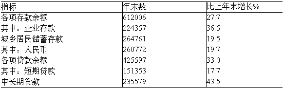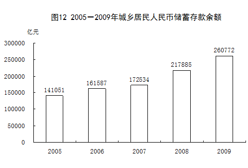 全年國(guó)內(nèi)出游人數(shù)達(dá)19.0億人次,比上年增長(zhǎng)11.1%;國(guó)內(nèi)旅游收入10184億元,增長(zhǎng)16.4%。入境旅游人數(shù)12648萬(wàn)人次,下降2.7%。其中,外國(guó)人2194萬(wàn)人次,下降9.8%;香港、澳門和臺(tái)灣同胞10454萬(wàn)人次,下降1.1%。在入境旅游者中,過(guò)夜旅游者5088萬(wàn)人次,下降4.1%。國(guó)際旅游外匯收入397億美元,下降2.9%。國(guó)內(nèi)居民出境人數(shù)達(dá)4766萬(wàn)人次,增長(zhǎng)4.0%。其中因私出境4221萬(wàn)人次,增長(zhǎng)5.2%,占出境人數(shù)的88.6%。 八、金融 年末廣義貨幣供應(yīng)量(M2)余額為60.6萬(wàn)億元,比上年末增長(zhǎng)27.7%;狹義貨幣供應(yīng)量(M1)余額為22.0萬(wàn)億元,增長(zhǎng)32.4%;流通中現(xiàn)金(M0)余額為3.8萬(wàn)億元,增長(zhǎng)11.8%。 年末全部金融機(jī)構(gòu)本外幣各項(xiàng)存款余額61.2萬(wàn)億元,比年初增加13.2萬(wàn)億元。其中人民幣各項(xiàng)存款余額59.8萬(wàn)億元,增加13.1萬(wàn)億元。全部金融機(jī)構(gòu)本外幣各項(xiàng)貸款余額42.6萬(wàn)億元,增加10.5萬(wàn)億元。其中人民幣各項(xiàng)貸款余額40.0萬(wàn)億元,增加9.6萬(wàn)億元。 表14:2009年全部金融機(jī)構(gòu)本外幣存貸款及其增長(zhǎng)速度 單位:億元