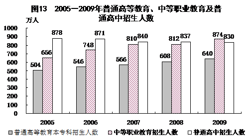 全年農(nóng)村金融合作機(jī)構(gòu)(農(nóng)村信用社、農(nóng)村合作銀行、農(nóng)村商業(yè)銀行)人民幣貸款余額4.7萬(wàn)億元,比年初增加9727億元。全部金融機(jī)構(gòu)人民幣消費(fèi)貸款余額5.5萬(wàn)億元,增加17976億元。其中,個(gè)人短期消費(fèi)貸款余額0.6萬(wàn)億元,增加2465億元;個(gè)人中長(zhǎng)期消費(fèi)貸款余額4.9萬(wàn)億元,增加15511億元。 全年上市公司通過(guò)境內(nèi)市場(chǎng)累計(jì)籌資3653億元,比上年增加1255億元。其中,首次公開(kāi)發(fā)行A股99只,籌資2062億元,增加995億元;A股再籌資(包括配股、公開(kāi)增發(fā)、非公開(kāi)增發(fā)、認(rèn)股權(quán)證)籌資1591億元,增加259億元;上市公司通過(guò)發(fā)行可轉(zhuǎn)債、可分離債、公司債籌資813億元,減少185億元。全年首次公開(kāi)發(fā)行創(chuàng)業(yè)板股票36只,籌資204億元。 全年發(fā)行非上市公司企業(yè)(公司)債券4252億元,比上年增加1885億元。企業(yè)發(fā)行短期融資券4612億元,增加281億元;中期票據(jù)6987億元,增加5250億元。發(fā)行中小企業(yè)集合票據(jù)12.7億元。 全年保險(xiǎn)公司原保險(xiǎn)保費(fèi)收入11137億元,比上年增長(zhǎng)13.8%,其中壽險(xiǎn)業(yè)務(wù)原保險(xiǎn)保費(fèi)收入7457億元;健康險(xiǎn)和意外傷害險(xiǎn)業(yè)務(wù)原保險(xiǎn)保費(fèi)收入804億元;財(cái)產(chǎn)險(xiǎn)業(yè)務(wù)原保險(xiǎn)保費(fèi)收入2876億元。支付各類賠款及給付3125億元,其中壽險(xiǎn)業(yè)務(wù)給付1269億元;健康險(xiǎn)和意外傷害險(xiǎn)賠款及給付281億元;財(cái)產(chǎn)險(xiǎn)業(yè)務(wù)賠款1576億元。 九、教育和科學(xué)技術(shù) 全年研究生教育招生51.1萬(wàn)人,在學(xué)研究生140.5萬(wàn)人,畢業(yè)生37.1萬(wàn)人。普通高等教育本專科招生639.5萬(wàn)人,在校生2144.7萬(wàn)人,畢業(yè)生531.1萬(wàn)人。各類中等職業(yè)教育招生873.6萬(wàn)人,在校生2178.7萬(wàn)人,畢業(yè)生619.2萬(wàn)人。全國(guó)普通高中招生830.3萬(wàn)人,在校生2434.3萬(wàn)人,畢業(yè)生823.7萬(wàn)人。全國(guó)初中招生1788.5萬(wàn)人,在校生5440.9萬(wàn)人,畢業(yè)生1797.7萬(wàn)人。普通小學(xué)招生1637.8萬(wàn)人,在校生10071.5萬(wàn)人,畢業(yè)生1805.2萬(wàn)人。特殊教育招生6.4萬(wàn)人,在校生42.8萬(wàn)人。幼兒園在園幼兒2657.8萬(wàn)人。