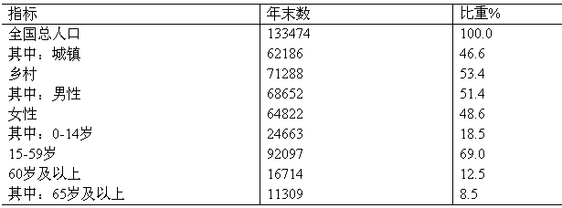 全年研究與試驗(yàn)發(fā)展(R&D)經(jīng)費(fèi)支出5433億元,比上年增長(zhǎng)17.7%,占國(guó)內(nèi)生產(chǎn)總值的1.62%,其中基礎(chǔ)研究經(jīng)費(fèi)272億元。全年國(guó)家安排了639項(xiàng)科技支撐計(jì)劃課題,1328項(xiàng)“863”計(jì)劃課題。累計(jì)建設(shè)國(guó)家工程研究中心127個(gè),國(guó)家工程實(shí)驗(yàn)室85個(gè)。國(guó)家認(rèn)定企業(yè)技術(shù)中心達(dá)到636家。省級(jí)企業(yè)技術(shù)中心達(dá)到5011家。啟動(dòng)實(shí)施新興產(chǎn)業(yè)創(chuàng)投計(jì)劃,支持設(shè)立20家創(chuàng)業(yè)投資基金。全年受理國(guó)內(nèi)外專利申請(qǐng)97.7萬(wàn)件,其中國(guó)內(nèi)申請(qǐng)87.8萬(wàn)件,占89.9%。受理國(guó)內(nèi)外發(fā)明專利申請(qǐng)31.5萬(wàn)件,其中國(guó)內(nèi)申請(qǐng)22.9萬(wàn)件,占72.8%。全年授予專利權(quán)58.2萬(wàn)件,其中國(guó)內(nèi)授權(quán)50.2萬(wàn)件,占86.2%。授予發(fā)明專利權(quán)12.8萬(wàn)件,其中國(guó)內(nèi)授權(quán)6.5萬(wàn)件,占50.9%。截至2009年底,有效專利152.0萬(wàn)件,其中國(guó)內(nèi)有效專利119.3萬(wàn)件,占78.5%;有效發(fā)明專利43.8萬(wàn)件,其中國(guó)內(nèi)有效發(fā)明專利18.0萬(wàn)件,占41.1%。全年共簽訂技術(shù)合同21.4萬(wàn)項(xiàng),技術(shù)合同成交金額3039億元,比上年增長(zhǎng)14.0%。全年成功發(fā)射衛(wèi)星6次。首臺(tái)千萬(wàn)億次超級(jí)計(jì)算機(jī)系統(tǒng)“天河一號(hào)”研制成功;嫦娥一號(hào)衛(wèi)星成功受控撞月。 年末全國(guó)共有產(chǎn)品檢測(cè)實(shí)驗(yàn)室25000個(gè),其中國(guó)家檢測(cè)中心414個(gè)。全國(guó)現(xiàn)有產(chǎn)品質(zhì)量、體系認(rèn)證機(jī)構(gòu)168個(gè),已累計(jì)完成對(duì)4.1萬(wàn)個(gè)企業(yè)的產(chǎn)品認(rèn)證。全國(guó)共有法定計(jì)量技術(shù)機(jī)構(gòu)3760個(gè),全年強(qiáng)制檢定計(jì)量器具4560萬(wàn)臺(tái)(件)。全年制定、修訂國(guó)家標(biāo)準(zhǔn)3158項(xiàng),其中新制定2102項(xiàng)。全年中央氣象臺(tái)和省級(jí)氣象臺(tái)共發(fā)布?xì)庀箢A(yù)警信號(hào)2737次,警報(bào)3950次。全國(guó)共有地震臺(tái)站1457個(gè),地震遙測(cè)臺(tái)網(wǎng)32個(gè)。全國(guó)共有海洋觀測(cè)站66個(gè)。測(cè)繪部門公開(kāi)出版地圖2060種,測(cè)繪圖書(shū)307種。 十、文化、衛(wèi)生和體育 年末全國(guó)共有藝術(shù)表演團(tuán)體2478個(gè),文化館3214個(gè),公共圖書(shū)館2833個(gè),博物館1996個(gè)。廣播電臺(tái)251座,電視臺(tái)272座,廣播電視臺(tái)2087座,教育臺(tái)44個(gè)。有線電視用戶17398萬(wàn)戶,有線數(shù)字電視用戶6200萬(wàn)戶。年末廣播節(jié)目綜合人口覆蓋率為96.3%;電視節(jié)目綜合人口覆蓋率為97.2%。全年生產(chǎn)故事影片456部,科教、紀(jì)錄、動(dòng)畫(huà)和特種影片102部。出版各類報(bào)紙437億份,各類期刊31億冊(cè),圖書(shū)70億冊(cè)(張)。年末全國(guó)共有檔案館4035個(gè),已開(kāi)放各類檔案7991萬(wàn)卷(件)。 年末全國(guó)共有衛(wèi)生機(jī)構(gòu)28.9萬(wàn)個(gè),其中醫(yī)院、衛(wèi)生院6.0萬(wàn)個(gè),社區(qū)衛(wèi)生服務(wù)中心(站)2.6萬(wàn)個(gè),婦幼保健院(所、站)3013個(gè),專科疾病防治院(所、站)1315個(gè),疾病預(yù)防控制中心(防疫站)3543個(gè),衛(wèi)生監(jiān)督所(中心)2706個(gè),診所及其他19.3萬(wàn)個(gè)。衛(wèi)生技術(shù)人員522萬(wàn)人,其中執(zhí)業(yè)醫(yī)師和執(zhí)業(yè)助理醫(yī)師216萬(wàn)人,注冊(cè)護(hù)士174萬(wàn)人。醫(yī)院和衛(wèi)生院床位396萬(wàn)張。鄉(xiāng)鎮(zhèn)衛(wèi)生院3.9萬(wàn)個(gè),床位91萬(wàn)張,衛(wèi)生技術(shù)人員89.8萬(wàn)人。全年甲、乙類法定報(bào)告?zhèn)魅静“l(fā)病人數(shù)377.6萬(wàn)例,報(bào)告死亡15105人;報(bào)告?zhèn)魅静“l(fā)病率284.34/10萬(wàn),死亡率1.14/10萬(wàn)。 全年運(yùn)動(dòng)健兒在30個(gè)項(xiàng)目中共獲得142個(gè)世界冠軍,11人3隊(duì)22次創(chuàng)22項(xiàng)世界紀(jì)錄。在第十一屆全國(guó)運(yùn)動(dòng)會(huì)上,共有7人9次創(chuàng)超5項(xiàng)世界紀(jì)錄;12人3隊(duì)21次創(chuàng)16項(xiàng)亞洲紀(jì)錄;29人5隊(duì)52次創(chuàng)39項(xiàng)全國(guó)紀(jì)錄。 十一、人口、人民生活和社會(huì)保障 年末全國(guó)總?cè)丝跒?33474萬(wàn)人,比上年末增加672萬(wàn)人。全年出生人口1615萬(wàn)人,出生率為12.13‰;死亡人口943萬(wàn)人,死亡率為7.08‰;自然增長(zhǎng)率為5.05‰。出生人口性別比為119.45。 表15:2009年人口數(shù)及其構(gòu)成 單位:萬(wàn)人