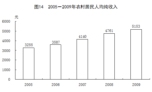 全年農(nóng)村居民人均純收入5153元,剔除價(jià)格因素,比上年實(shí)際增長(zhǎng)8.5%;城鎮(zhèn)居民人均可支配收入17175元,實(shí)際增長(zhǎng)9.8%。農(nóng)村居民家庭食品消費(fèi)支出占消費(fèi)總支出的比重為41.0%,城鎮(zhèn)為36.5%。按2009年農(nóng)村貧困標(biāo)準(zhǔn)1196元測(cè)算,年末農(nóng)村貧困人口為3597萬(wàn)人。