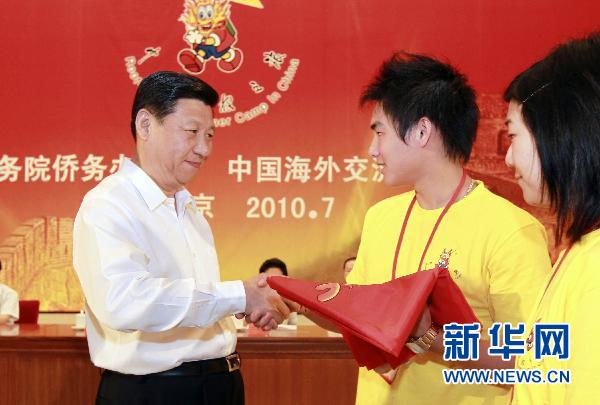 7月25日,中共中央政治局常委、國家副主席習近平在北京人民大會堂出席2010年海外華裔及港澳臺地區青少年“中國尋根之旅”夏令營開營式并講話,向營員代表頒授營旗。這是習近平向營員代表頒授營旗。新華社記者 謝環馳 攝