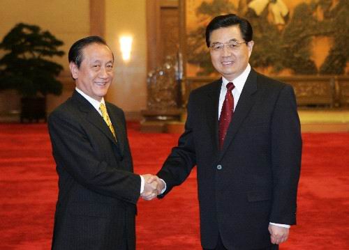 7月12日,中共中央總書記胡錦濤在北京人民大會堂會見新黨主席郁慕明率領的新黨紀念抗戰勝利60周年大陸訪問團一行。 新華社記者 馬占成 攝