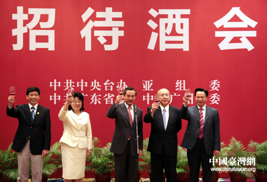 11月11日,中共中央臺辦與廣州亞運會組委會、廣東省委、廣州市委共同舉辦招待酒會,歡迎前來出席廣州亞運會開幕式的臺灣各界嘉賓。