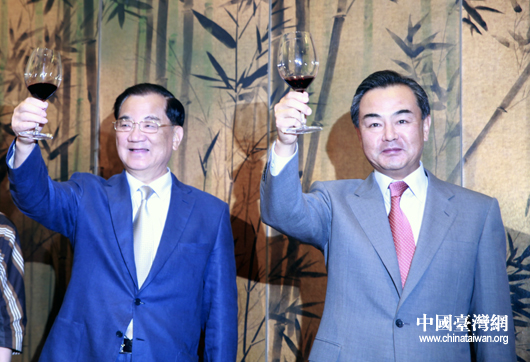 中共中央臺辦、國務院臺辦主任王毅與國民黨榮譽主席連戰舉杯預祝大運會圓滿成功。(中國臺灣網 劉海偉 攝)