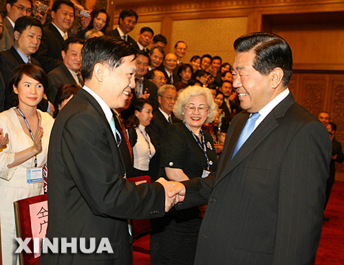 7月19日,全國政協主席賈慶林在北京人民大會堂會見臺灣工商建研會大陸經貿考察團一行。新華社記者鞠鵬攝