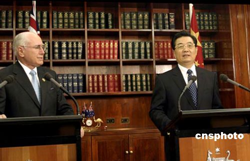 2007年9月6日,中國國家主席胡錦濤在悉尼與澳大利亞總理霍華德參加簽字儀式后共同會見記者。 中新社發 賴海隆 攝