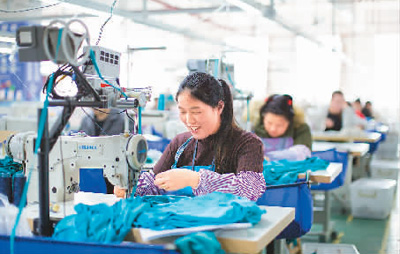 在黔東南苗族侗族自治州榕江縣工業園區,搬遷群眾在制作衣服。
