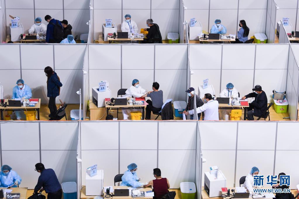 2月22日,在北京市海淀區中關村軟件園二期一家企業內的臨時接種點,醫護人員(左)引導企業員工接種新冠疫苗。新華社記者 任超 攝