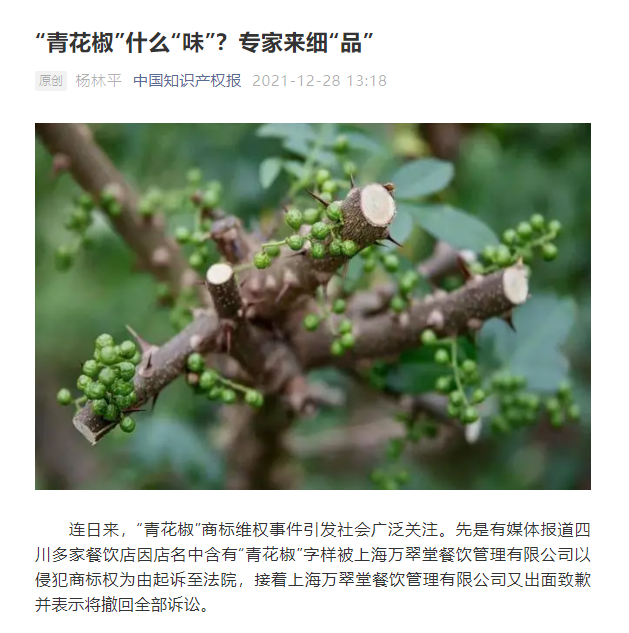 “青花椒是一種植物及其種子以及由其制成的調味品的名稱,故‘青花椒’用于指代調味品屬于通用名稱,處于公有領域,一般情形下因其缺乏顯著性,不得作為商標注冊在調味品類商品上。”王蓮峰表示。