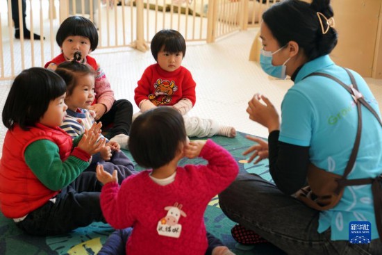 3月7日,在江寧路街道社區(qū)綜合為老服務(wù)中心,“寶寶屋”的看護人員帶領(lǐng)小朋友們玩游戲。