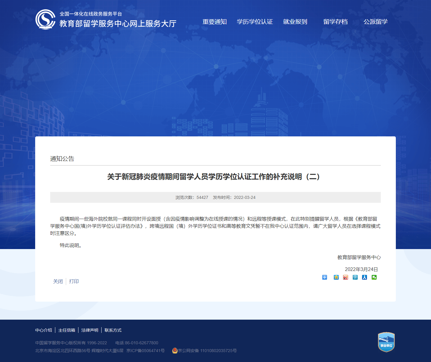 此外,據(jù)教育部留學(xué)服務(wù)中心早前發(fā)布的消息稱(chēng),國(guó)(境)外學(xué)歷學(xué)位認(rèn)證結(jié)果(以下稱(chēng)認(rèn)證結(jié)果)落款日期為認(rèn)證評(píng)估完成后電子證照認(rèn)證結(jié)果的發(fā)放日期,與留學(xué)人員的學(xué)習(xí)經(jīng)歷及學(xué)位授予時(shí)間無(wú)關(guān)。認(rèn)證結(jié)果不等同于國(guó)(境)外學(xué)歷學(xué)位證書(shū),其落款日期對(duì)留學(xué)人員學(xué)習(xí)經(jīng)歷等實(shí)際情況不產(chǎn)生影響,不能作為判斷相關(guān)事項(xiàng)的依據(jù),教育部留學(xué)中心亦無(wú)法對(duì)已出具的認(rèn)證結(jié)果落款日期作出修改。