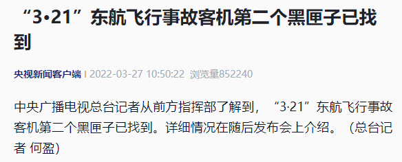 中央廣播電視總臺記者從前方指揮部了解到,“3·21”東航飛行事故客機第二個黑匣子已找到。詳細情況在隨后發布會上介紹。