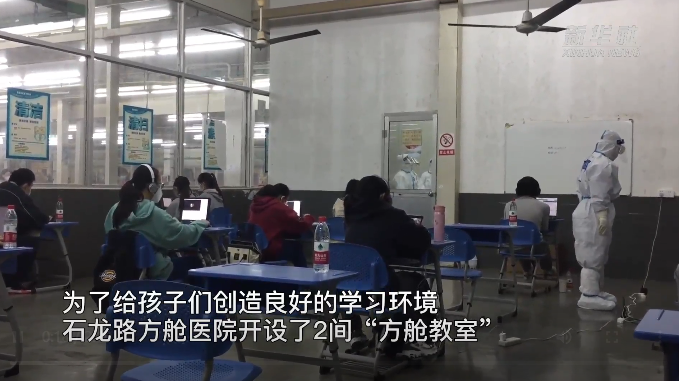 為了給孩子們創(chuàng)造良好的學習環(huán)境,石龍路方艙醫(yī)院開設了2間“方艙教室”。在教室里,孩子們用自己的電子設備,在線認真傾聽老師授課并按時完成課后作業(yè)。
