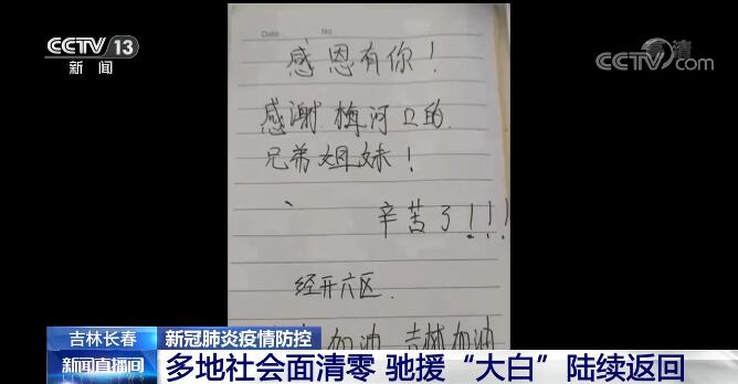 4月12日下午,長春新區(qū)、經(jīng)濟(jì)技術(shù)開發(fā)區(qū),凈月高新技術(shù)產(chǎn)業(yè)開發(fā)區(qū)、二道區(qū)基本實現(xiàn)社會面動態(tài)清零。在經(jīng)濟(jì)技術(shù)開發(fā)區(qū)的封控區(qū)中央公園小區(qū),完成包保援助任務(wù)的梅河口市志愿者們與居民道別。此次,梅河口市共派出了5000名志愿者援助長春,他們的付出得到了居民們的認(rèn)可,不能面對面交流,大家就在房門上留下各種感謝的字條。