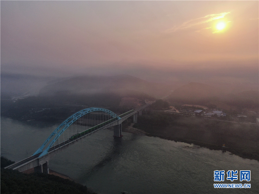動(dòng)車迎著朝陽行駛在位于云南省西雙版納傣族自治州境內(nèi)的中老鐵路橄欖壩瀾滄江大橋上(4月11日攝,無人機(jī)照片)。